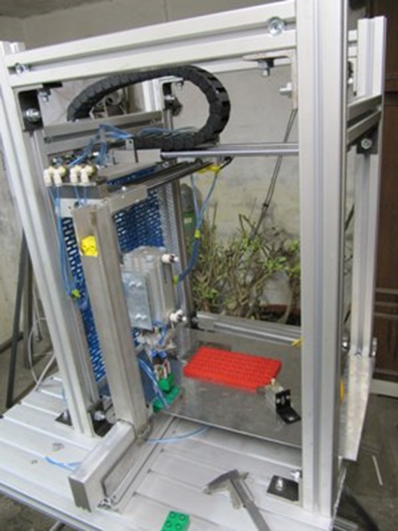 Alexander Thies et Adrian Wörtche, deux élèves de terminale du lycée Landrat Gruber de Dieburg (Allemagne) ont construit une machine automatisée de construction de tours en Lego dans le cadre d'un projet de fin d'études. L'appareil a été programmé de manière à pouvoir empiler des Lego Duplo pour en faire des tours et des murs. Pour ne pas avoir de noeuds entre les conduits pneumatiques et les câbles des capteurs et que la machine fonctionne bien, les deux élèves étaient d'accord sur le fait que câbles et conduits devaient être dans une chaîne porte-câbles. Ils avaient déjà entendu parler des chaînes porte-câbles, ayant visité le salon Motek en 2010 avec leur professeur. Le stand igus® et les impressionnantes machines d'exposition sur lesquelles ils avaient pu voir les chaînes porte-câbles en action leur étaient restées à l'esprit. Ils se sont tout de suite adressés à igus® et ont posé leur candidature au programme yes, dédié aux écoliers et aux étudiants. La chaîne porte-câbles dont ils avaient besoin pour leur machine a été sponsorisée par igus®. En plus de la chaîne porte-câbles, leur machine fait appel à une commande programmable et à deux tables linéaires à vis croisées sur lesquelles se trouve un dispositif à pince pour la préhension et la dépose des Duplo. Celui-ci prend les cubes préparés dans un stock et les empile sur une plaque. La pince se compose de plusieurs vérins à commande individuelle. / Mise en place des chaînes porte-câbles qui guident les câbles jusqu'aux vis et à la pince.
