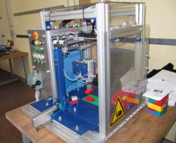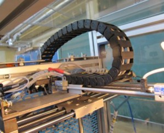 Tous les câbles sont dans une chaîne porte-câbles afin que la machine puisse bâtir des tours en Lego de manière fiable et sans devoir s'arrêter