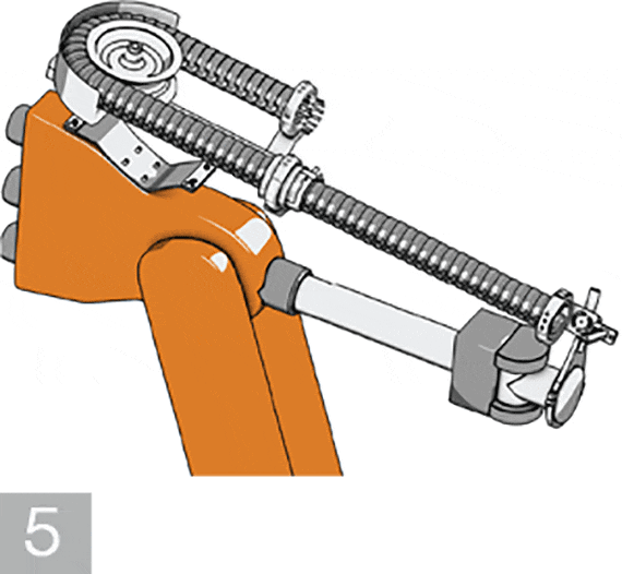 Pour obtenir un réglage optimal de la force de rappel, remplissez la triflex® R de câbles et de conduits et faites descendre le robot vers le bas, l´axe 6 étant en position verticale. Augmentez la pression à l´aide du pressostat jusqu´à ce que