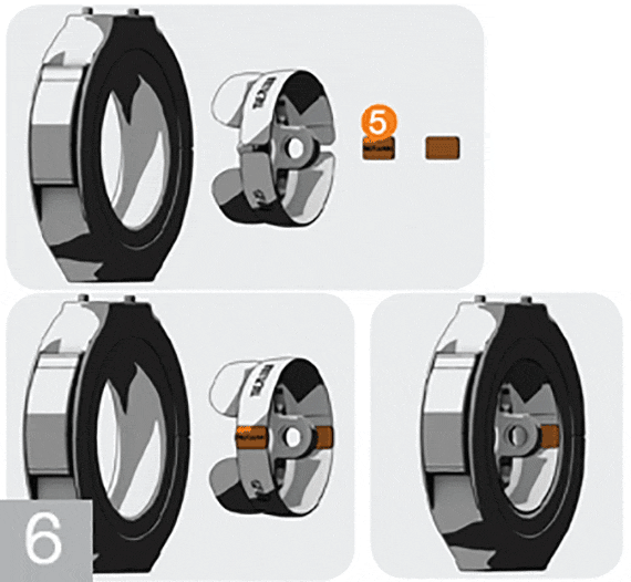Alignez le collier de l´axe 6 et le support pivotant avec l´élément de fixation de manière à ce