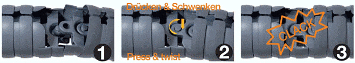 La version B présentant une stabilité encore plus grande, un outil de démontage est nécessaire pour séparer les maillons de cette chaîne porte-câbles.